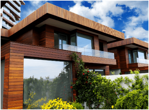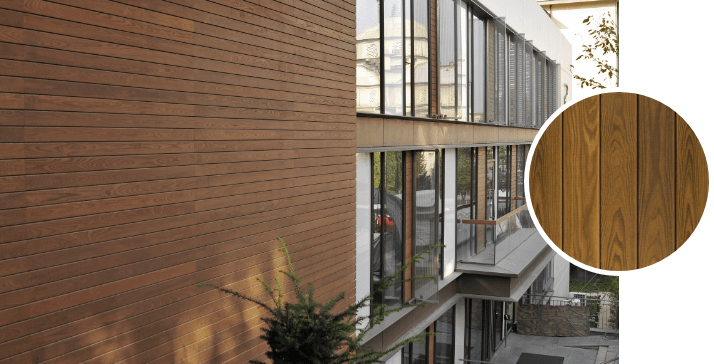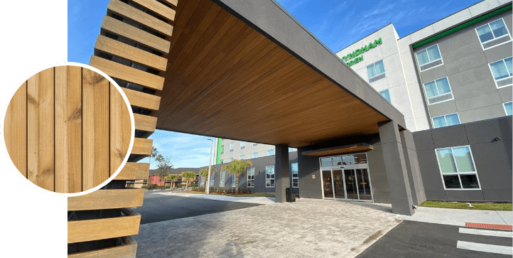 Scandinavian Thermowood® is a cost-effective thermally modified wood that comes in a light tan color with a knotty texture. It’s an excellent choice for areas with high moisture as it’s resistant to rot and decay.